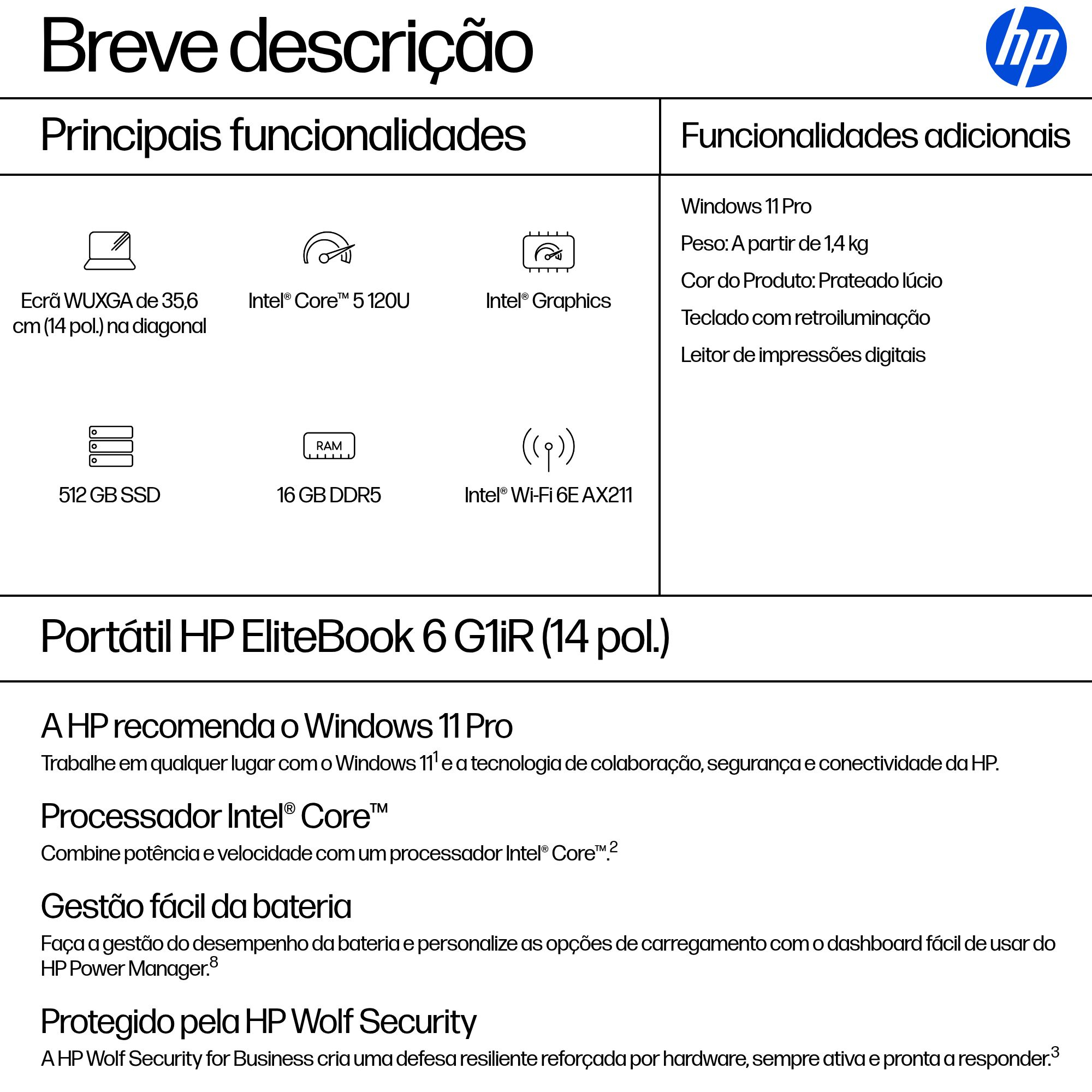 HP EliteBook 6 G1iR 14 inch Notebook PC. Tipo de produto: Computador portátil, Forma: Concha. Família de processador: Intel Core 5, Modelo de processador: 120U. Tamanho do ecrã na diagonal: 35,6 cm (14″), Tipo de HD: WUXGA, Resolução: 1920 x 1200 pixels. Capacidade da memória incorporada: 16 GB, Tipo de memória interna: DDR5-SDRAM. Modelo da placa gráfica on-board: Intel Graphics. Sistema operativo instalado: Windows 11 Pro. Cor do produto: Prateado